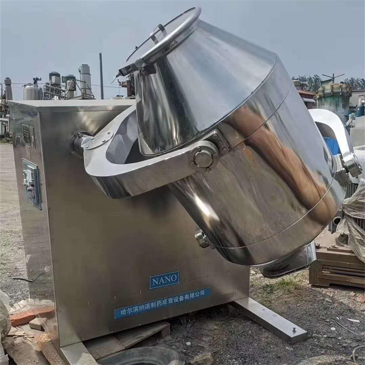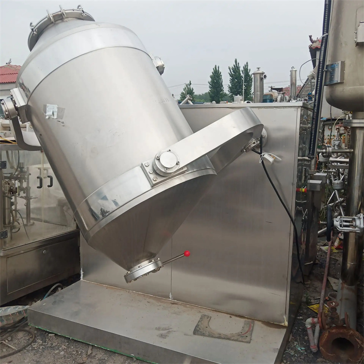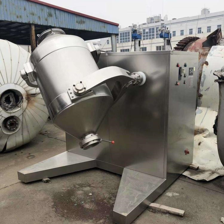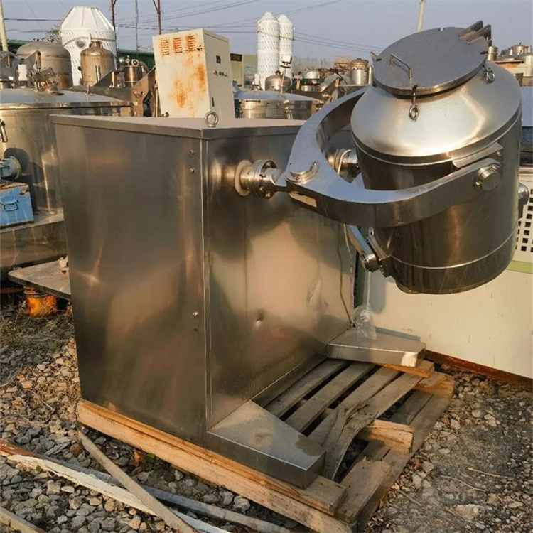 二維混合機(jī)是由轉(zhuǎn)筒、擺動(dòng)架、機(jī)架三大部分組成。轉(zhuǎn)筒安裝在擺動(dòng)架上,由四個(gè)滾輪支撐,并由兩個(gè)擋輪對(duì)其進(jìn)行軸向定位,在四個(gè)支撐滾輪中,兩個(gè)傳動(dòng)輪由旋轉(zhuǎn)動(dòng)力系統(tǒng)轉(zhuǎn)動(dòng),使轉(zhuǎn)筒旋轉(zhuǎn)。擺動(dòng)架由一組曲柄擺桿機(jī)構(gòu)驅(qū)動(dòng),曲柄擺桿機(jī)構(gòu)安裝在機(jī)架上,擺動(dòng)架由軸承部件支撐在機(jī)架上,使轉(zhuǎn)筒在轉(zhuǎn)動(dòng)的同時(shí)又參與擺動(dòng),使筒中物料得以充分混合。